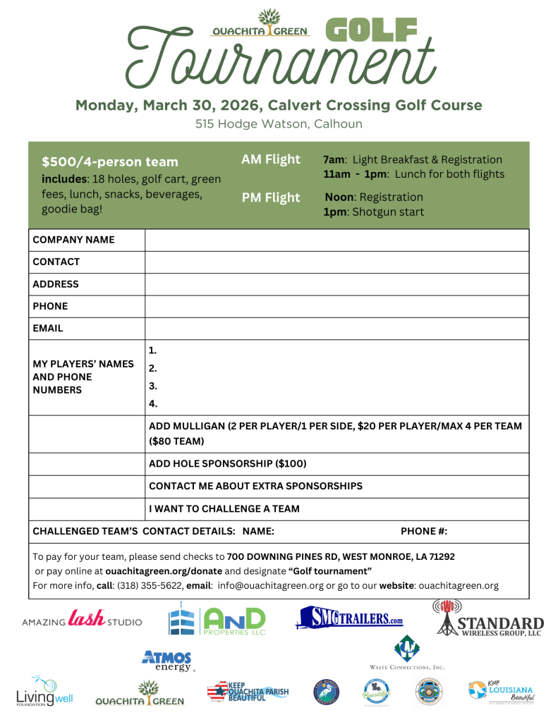 Pay online at ouachitagreen.org/donate and designate “Golf Tournament”.