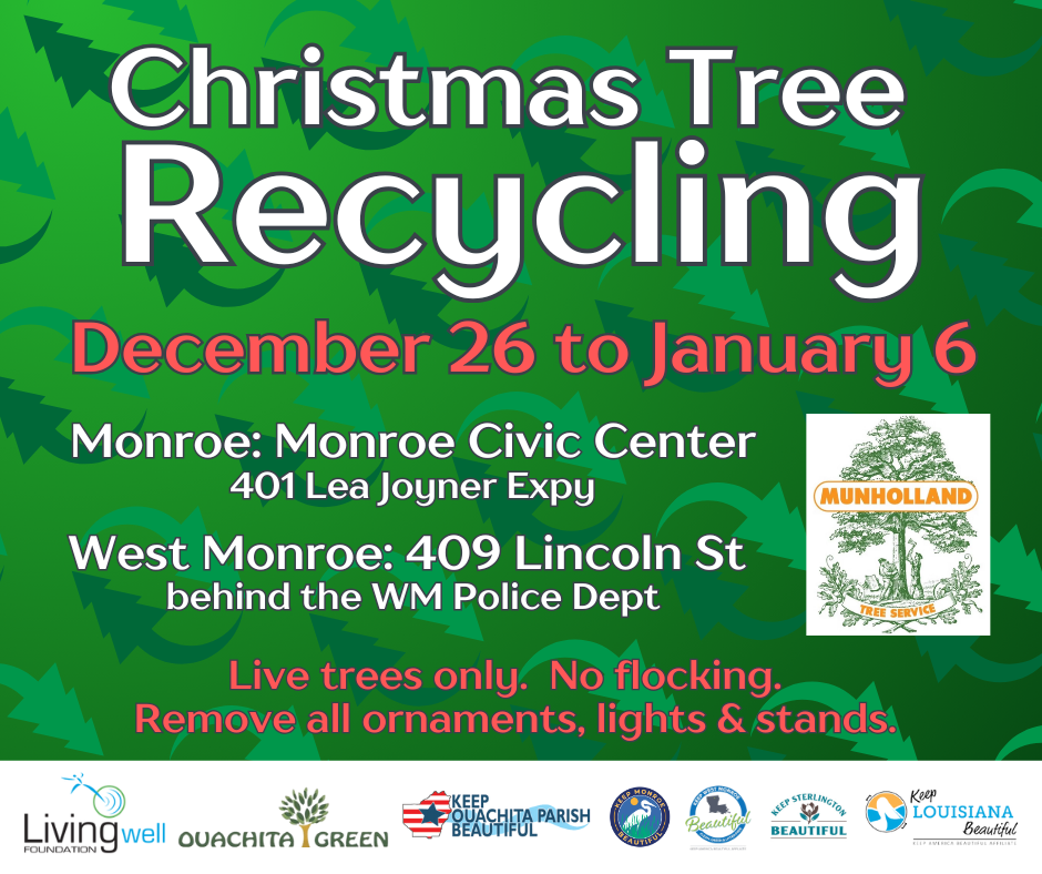 Live Christmas Tree Recycling Live Christmas trees only (no artificial trees). Please remove all tinsel, ornaments, lights and stands. No flocked trees, please. Trees can be dropped off at the Monroe Civic Center [...]